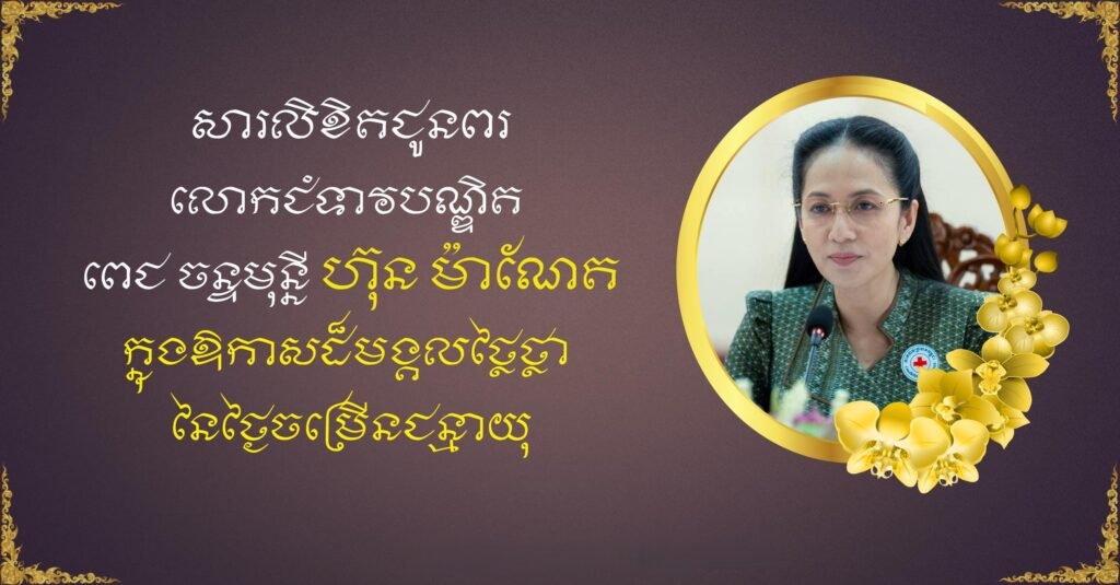 (ភ្នំពេញ)៖ ឯកឧត្តម ឧត្តមសេនីយ៍ឯក ដោក សុផា សាកលវិទ្យាធិការសាកល វិទ្យាល័យការពារជាតិ ក្នុងនាមសាកល វិទ្យាធិការរង នាយក នាយករង មហាវិទ្យាល័យ មជ្ឈមណ្ឌល យោធាចារ្យ និស្សិតនិងសិក្ខាកាមទាំងអស់ សូមគោរពជូន នូវសព្ទសាធុការពរ គ្រប់ប្រការជូនចំពោះ លោកជំទាវបណ្ឌិត ពេជ ចន្ទមុន្នី ហ៊ុន ម៉ាណែត ក្នុងឱកាសដ៏ឧត្តុង្គឧត្តមថ្លៃថ្លា នៃពិធីចម្រើនជន្មាយុ ដែលប្រព្រឹត្តទៅនៅថ្ងៃទី២២ ខែមករា ឆ្នាំ២០២៦នេះ។
