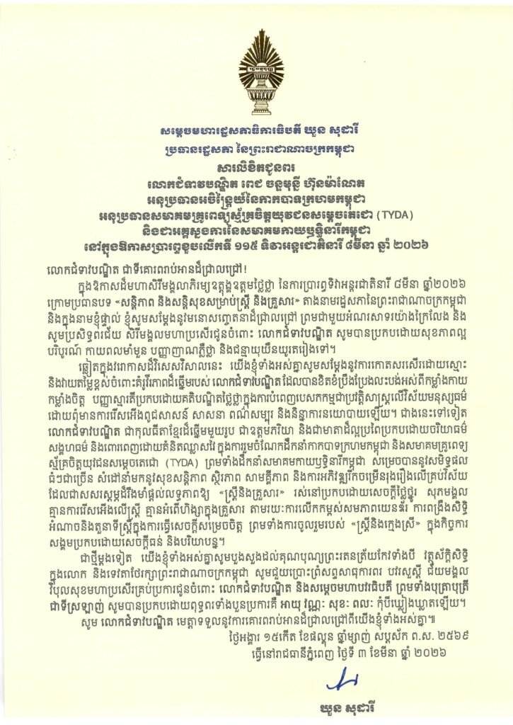 (ភ្នំពេញ)៖ សម្ដេចមហារដ្ឋសភាធិការធិបតី ឃួន សុដារី ប្រធានរដ្ឋសភា ព្រមទាំងថ្នាក់ដឹកនាំ និងមន្ត្រីរដ្ឋសភាទាំងអស់ សូមផ្ញើសារជូនពរ លោកជំទាវបណ្ឌិត ពេជ ចន្ទមុន្នី ហ៊ុនម៉ាណែត អនុប្រធានអចិន្ត្រៃយ៍នៃកាកបាទក្រហមកម្ពុជា អនុប្រធានសមាគមគ្រូពេទ្យស្ម័គ្រចិត្តយុវជនសម្តេចតេជោ (TYDA) និងជាអគ្គស្នងការនៃសមាគមកាយឫទ្ធិនារីកម្ពុជា នៅក្នុងឱកាសប្រារព្ធខួបលើកទី ១១៥ ទិវាអន្តរជាតិនារី ៨មីនា ឆ្នាំ២០២៦ ដែលធ្វើឡើងក្រោមប្រធានបទ «សន្តិភាព និងសន្តិសុខសម្រាប់ស្ត្រី និងគ្រួសារ»។ ឆ្លៀតក្នុងវរោកាសដ៏វិសេសវិសាលនេះ យើងខ្ញុំទាំងអស់គ្នាសូមសម្ដែងនូវការកោតសរសើរដោយស្មោះ និងវាយតម្លៃខ្ពស់ចំពោះគំរូវីរភាពដ៏ឆ្នើមរបស់ លោកជំទាវបណ្ឌិត ដែលបានខិតខំប្រឹងប្រែងលះបង់អស់ពីកម្លាំងកាយ កម្លាំងចិត្ត បញ្ញាស្មារតីប្រកបដោយគតិបណ្ឌិតថ្លៃថ្លាក្នុងការបំពេញបេសកកម្មជាប្រវត្តិសាស្ត្រលើវិស័យមនុស្សធម៌ ដោយពុំមានការរើសអើងពូជសាសន៍ សាសនា ពណ៌សម្បុរ និងនិន្នាការនយោបាយឡើយ។ ជាងនេះទៅទៀត លោកជំទាវបណ្ឌិត ជាកុលធីតាខ្មែរដ៏ឆ្នើមមួយរូប ជាឧត្តមភរិយា និងជាមាតាដ៏ល្អប្រពៃប្រកបដោយចរិយាធម៌ សង្គហធម៌ និងពោរពេញដោយគំនិតឈ្លាសវៃ ក្នុងការរួមចំណែកដឹកនាំកាកបាទក្រហមកម្ពុជា និងសមាគមគ្រូពេទ្យស្ម័គ្រចិត្តយុវជនសម្តេចតេជោ (TYDA) ព្រមទាំងដឹកនាំសមាគមកាយឫទ្ធិនារីកម្ពុជា សំម្រេចបាននូវសមិទ្ធផលធំៗជាច្រើន សំដៅនាំមកនូវសុខសន្តិភាព ស្ថិរភាព សាមគ្គីភាព និងការអភិវឌ្ឍរីកចម្រើនរុងរឿងលើគ្រប់វិស័យ ដែលជាសសរស្តម្ភដ៏រឹងមាំផ្តល់លទ្ធភាពឱ្យ «ស្រ្តីនិងគ្រួសារ រស់នៅប្រកបដោយសេចក្តីថ្លៃថ្នូរ សុភមង្គល គ្មានការរើសអើងលើស្ត្រី គ្មានអំពើហិង្សាក្នុងគ្រួសារ តាមរយៈការលើកកម្ពស់សមភាពយេនឌ័រ ការពង្រឹងសិទ្ធិអំណាចនិងតួនាទីស្ត្រីក្នុងការធ្វើសេចក្តីសម្រេចចិត្ត ព្រមទាំងការចូលរួមរបស់ «ស្រ្តីនិងក្មេងស្រី» ក្នុងកិច្ចការសង្គមប្រកបដោយសេចក្តីធន់ និងបរិយាបន្ន។ ជាថ្មីម្ដងទៀត យើងខ្ញុំទាំងអស់គ្នា សូមបួងសួងដល់គុណបុណ្យព្រះរតនត្រ័យកែវទាំងបី វត្ថុស័ក្តិសិទ្ធិ ក្នុងលោក និងទេវតាថែរក្សាព្រះរាជាណាចក្រកម្ពុជា សូមជួយប្រោះព្រំសព្ទសាធុការពរ បវរសួស្ដី ជ័យមង្គល វិបុលសុខមហាប្រសើរគ្រប់ប្រការជូនចំពោះ លោកជំទាវបណ្ឌិត និង សម្តេចមហាបវរធិបតី ព្រមទាំងបុត្រាបុត្រីជាទីស្រឡាញ់ សូមបានប្រកបដោយពុទ្ធពរទាំងបួនប្រការគឺ អាយុ វណ្ណៈ សុខៈ ពលៈ កុំបីឃ្លៀងឃ្លាតឡើយ៕